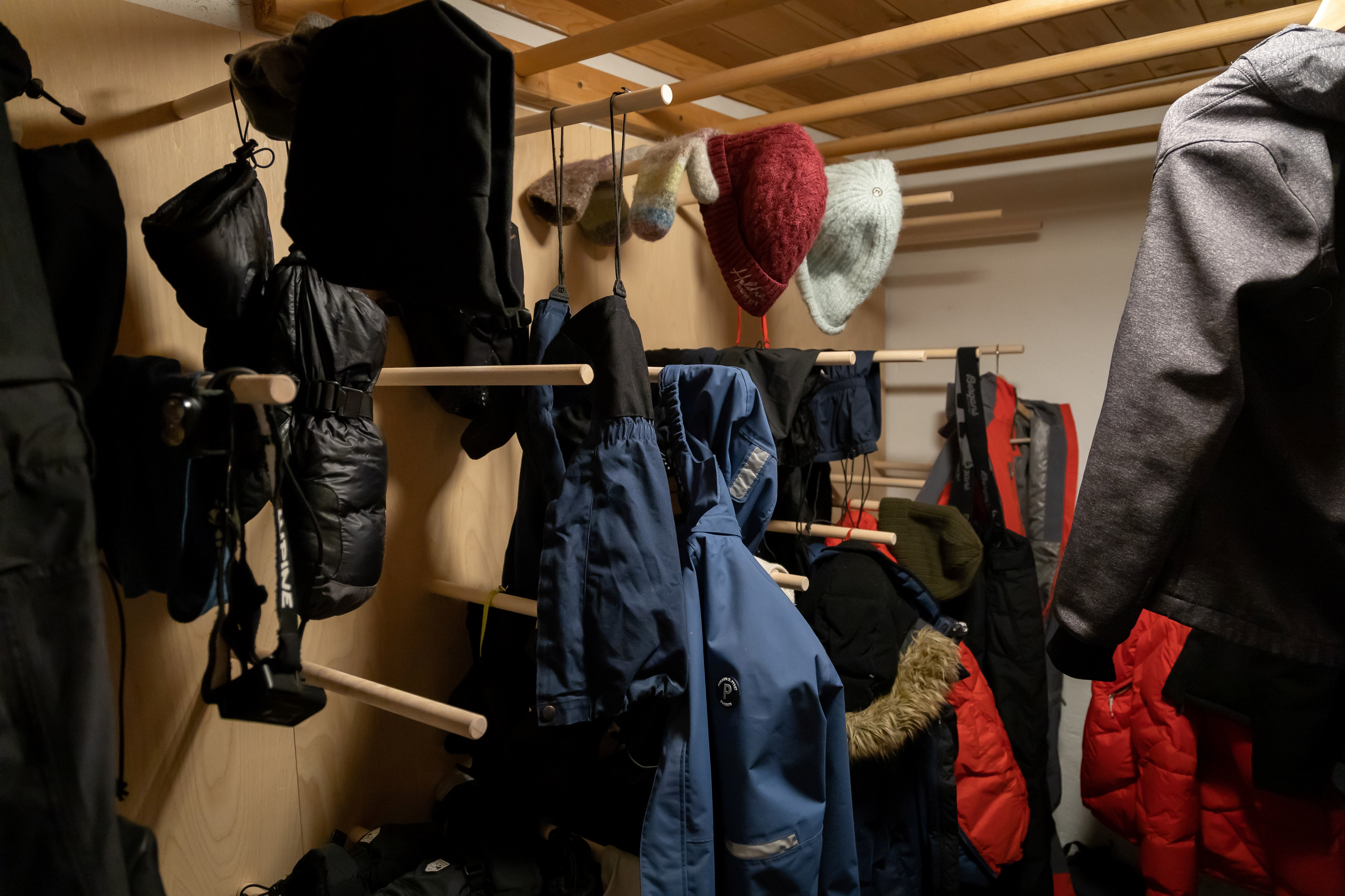 Mye kan være vått etter en dag ute, og det er som regel godt tilrettelagt for tørking av klær og sko ved ovnen. Benytt tørkerom dersom dette finnes på hytten. Heng opp det våte tøyet og få på deg tørt så fort som mulig. Når tøyet er tørt tar du det vekk, og gjør plass til at andre gjester kan tørke sitt våte tøy.