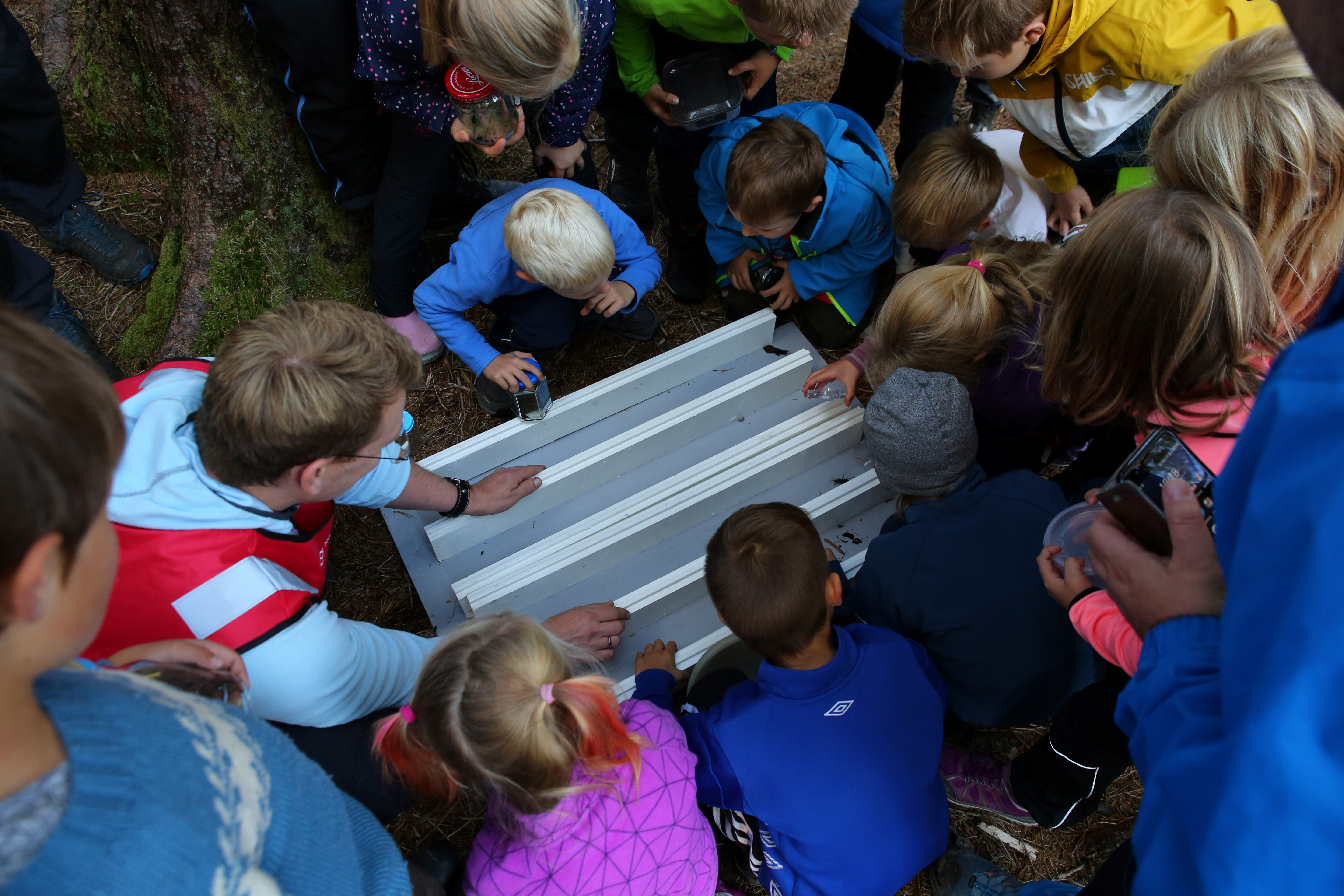 Finn frem forstørrelsesglass og let etter insekter i lyngen eller under steiner. Når barna har funnet hvert sitt insekt, kan dere lage en “bane” på papir og se hvilket insekt som er raskest!