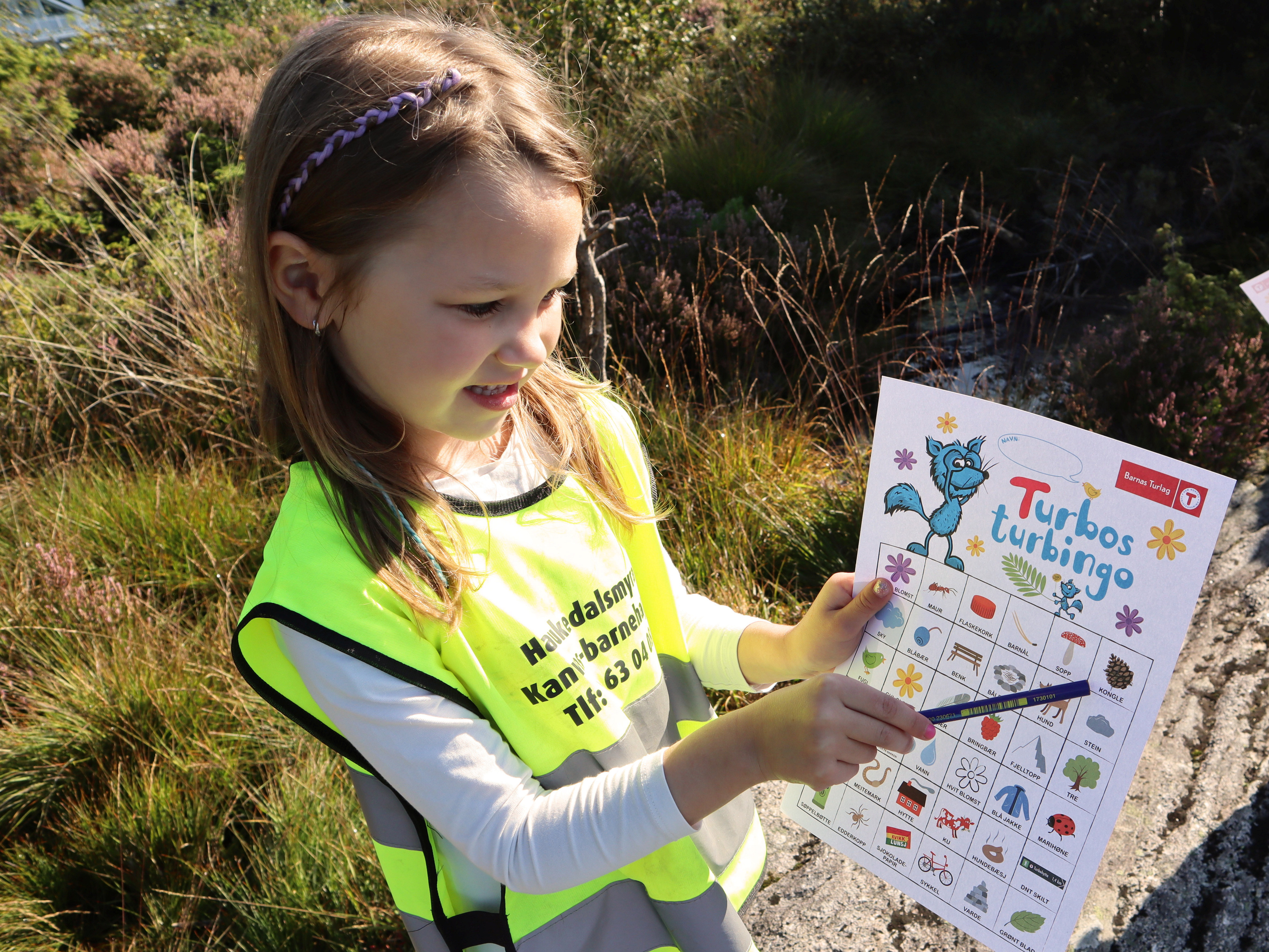 Før turen kan dere lage bingoark med bilder eller navn på ting man kan finne i naturen: kongle, furu, rød blomst, frosk, bæsj! Barna krysser av etter hvert som de finner tingene. Førstemann til bingo får en premie – eller kanskje bare heder og ære.