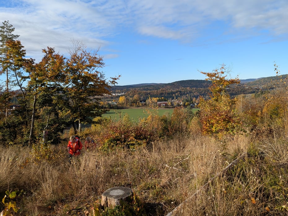 Seniortur Gravdalsrunden 15 oktober 25. Dagens tur startet fra parkeringen ved bensinstasjonen på Gravdal og gikk forbi Søndre Holt mot Andebuveien. Tok mot nord og over åskammen forbi snuplassen til Gapahuken i Elg krysset, hvor nistepakken ble fortært. Gikk deretter inn til Rådyrkrysset og tilbake før nedstigningen mot Nordre Holt og til parkeringsplassen. Turen gikk i et kupert terreng på en miks av stier og skogsveier. 46 turgåere deltok på en fin tur i et fantastisk høstvær. Wenche Petterson ledet turen på en fin måte.