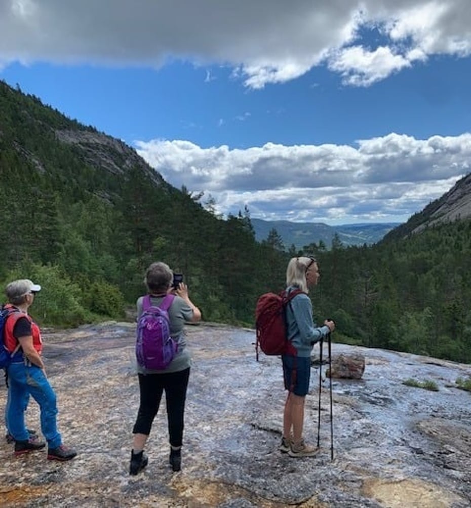 24 personer og 2 hunder stilte til start etter å kjørt opp i bil ca 3 km og mange høydemeter. Flotte svaberg oppover og pulsen fikk kjørt seg. Noe vått og glatt enkelte plasser etter mye regn i det siste.