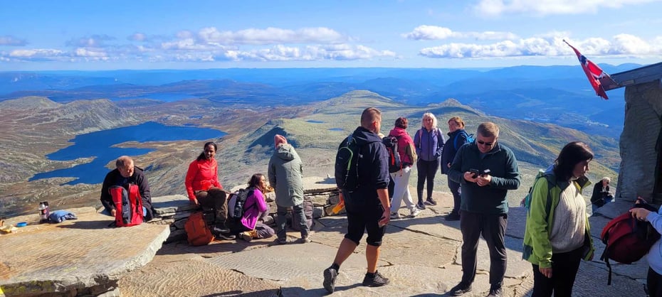 Etter noen timer var vi fremme ved parkeringen på Stavsro ca 1100 moh og turen startet ganske umiddelbart hvor vi nå kunne skimte toppen i tåka. Turfølget gikk på med godt mot, det var 14 grader og litt overskyet i starten. Etter flere høydemeter og kilometer med motivasjon, svette, slitne kropper og stive bein kom vi alle til toppen. De ansiktene som møtte oss på toppen viste glede og en utrolig mestring. Dette er noe vi som turledere ikke vil glemme så lett. På toppen fikk alle servert rykende ferske vafler, hvor de satt og spiste med verdens beste utsikt
