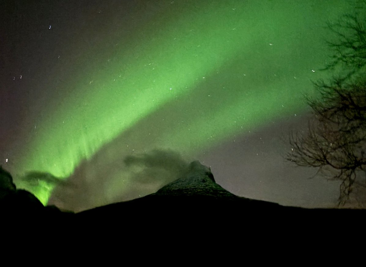 I tillegg til selve hytta fikk vi og en kjempeopplevelse seint på kvelden. Skydekket forsvant, og en helt fantastisk stjernehimmel kom til syne. Det var noe helt annet enn det vi ser fra studenthybelen på Mørkved. Rosinen i pølsa var da et kraftig nordlys kom over Djeveltanna (fjelltoppen i nord). Helt magisk å stå utenfor hytta og oppleve stjernene og nordlyset.