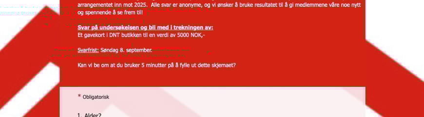 Svar på undersøkelsen og bli med i trekningen av: Et gavekort i DNT butikken til en verdi av 5000 NOK,-. NB! For at vi skal kunne trekke en vinner av gavekortet, trenger vi at du gir en tommel opp på Facebook-posten til spørreundersøkelsen. Vi kontakter en vinner etter 8. september.