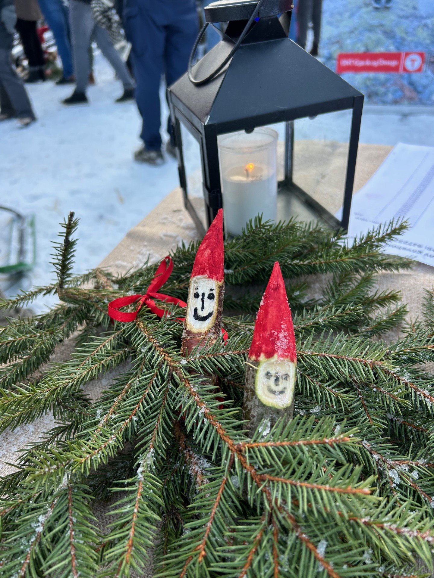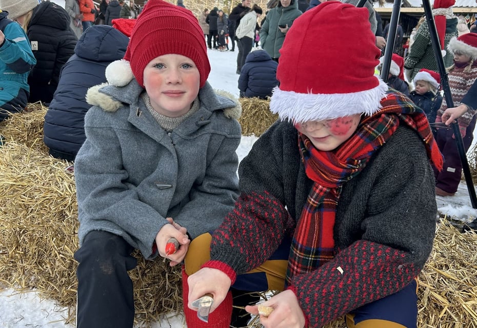 Vi i DNT Gjøvik og omegn står oppe på Øvrejordet ved bålet. Her kan barna spikke nisser. Heng de på juletreet, eller gi de bort i gave til onkel eller besteforeldre. De kommer garantert til å bli glade for en hjemmelaget julegave.