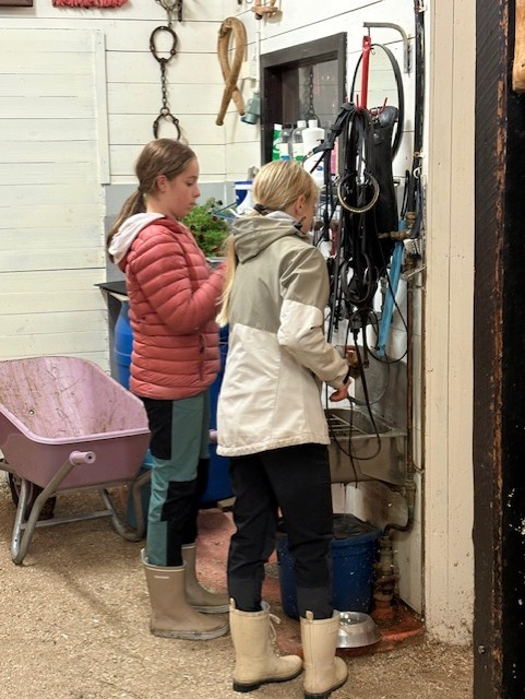 Gruppa ble delt i to, slik at alle fikk være med på ulike oppgaver og aktiviteter gjennom dagene. Hver dag hadde én gruppe ansvar for morgenfôring i stallen, mens den andre laget frokost – med både vafler og pannekaker på menyen! På kveldene ble det ordnet kveldskos, og til slutt hjalp jentene til med nattfôringen av hestene.