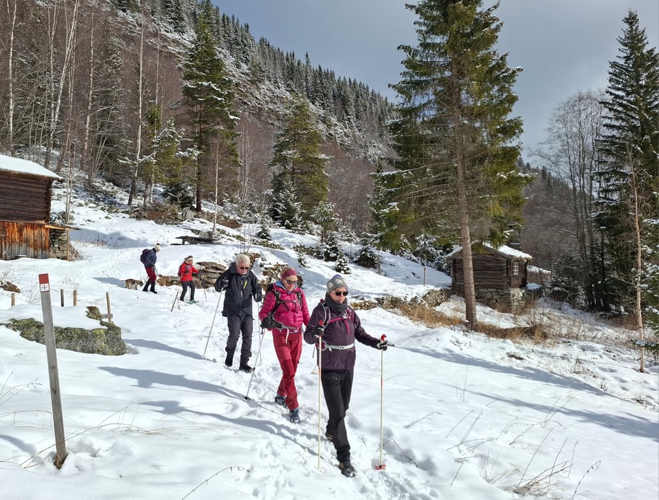 Stien brukes jevnt og trutt gjennom vinteren, så nå var det et godt og fast underlag. Noen gikk med truger, andre med piggsko, brodder eller bare fjellsko. Flotte utsikter over dalen og snø på trærne.