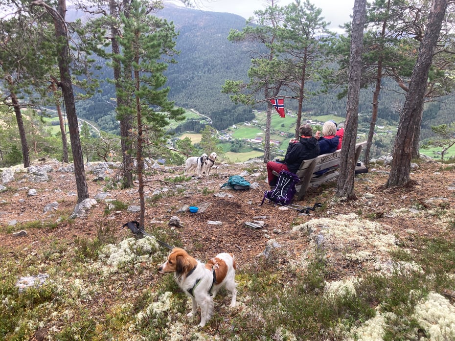 Vel oppe satte vi oss og åt nista vår. Det er satt en benk her, og denne er plassert slik at vi får fin utsikt mot jordbruks/kulturlandskapet i Sel fra denne.