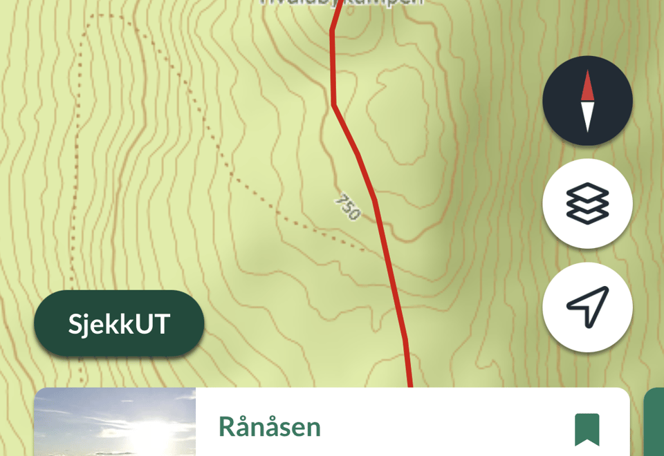 Klikk på bildet av turmålet i app-en slik at du får opp kartet der turmålet er markert. Når du er maks. 75 meter unna toppen/turmålet klikker du på ikonet i kartet og Sjekker ut.