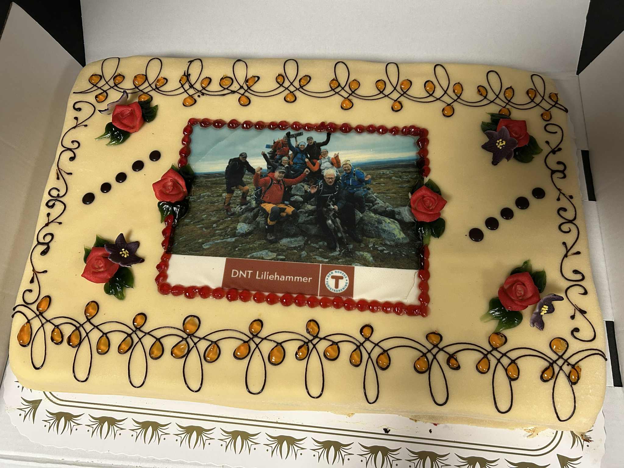 Granum Bakeri hadde laget en flott og smakfull kake til anledningen. Bildet på kaka er tatt av Tormod Kindem, som er turleder og frivilig både i DNT Lillehammer, og Hamar og Hedmarken turistforening.