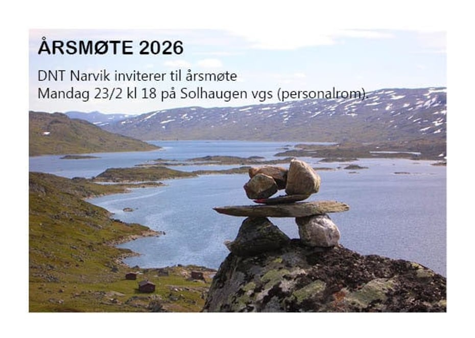 DNT Narvik inviterer til årsmøte mand. 23/2 kl 18 på Solhaugen vgs (personalrom). Innkomne saker må være daglig leder i hende innen 18/2 (jon.sommerseth@dnt.no) Vanlige årsmøtesaker. Nye vedtekter. Hederstegn. Servering. VELKOMMEN!
