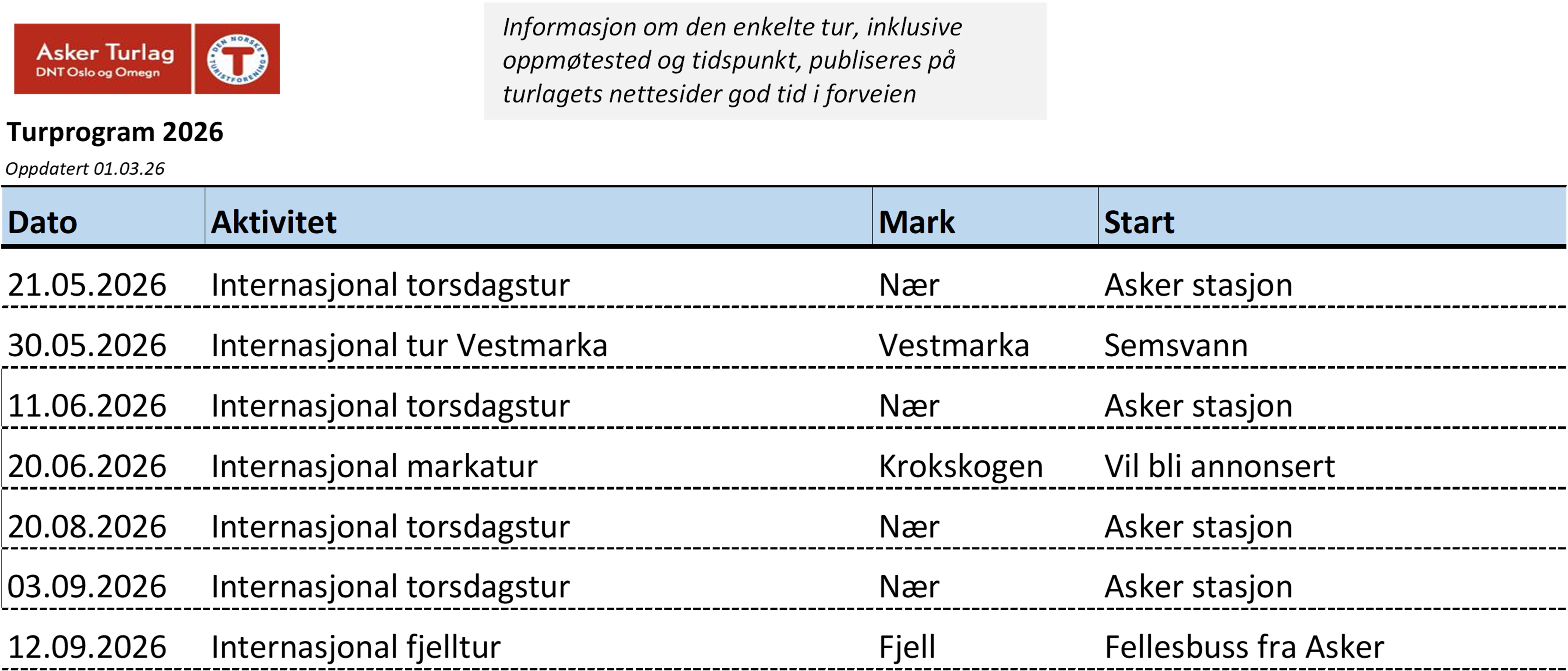 Informasjon om den enkelte tur, inklusive oppmøtested og tidspunkt, publiseres på turlagets nettsider god tid i forkant av arrangementet.