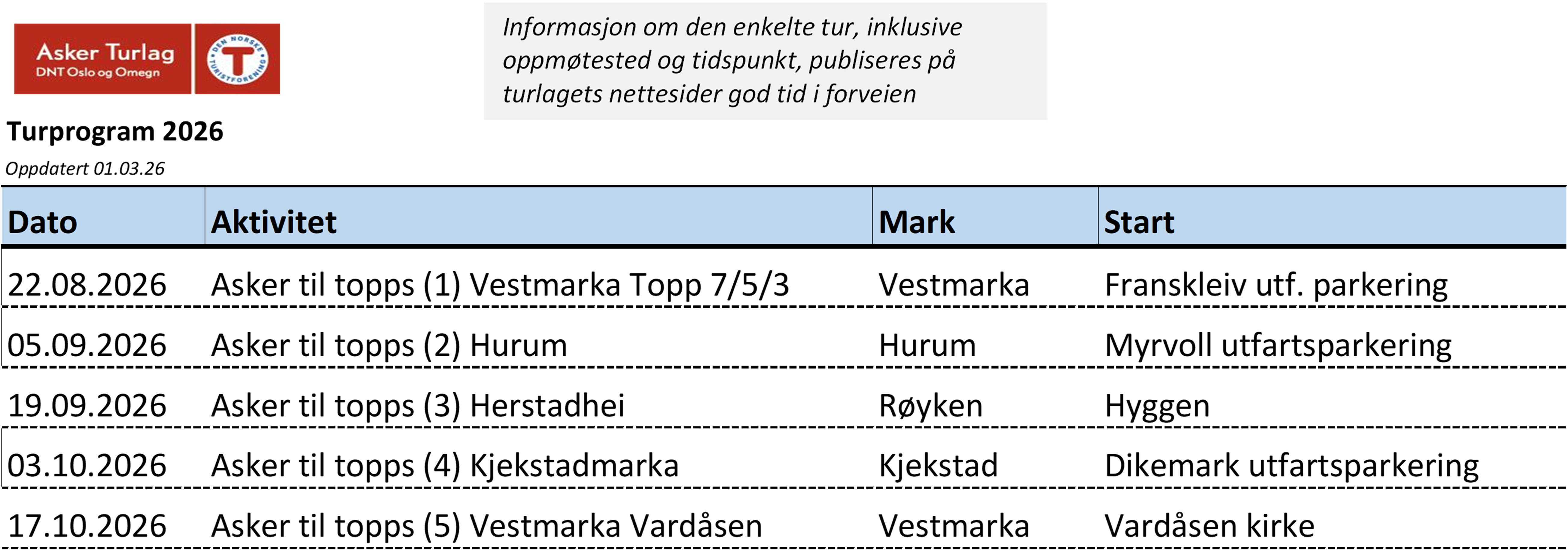 Man kan gå etappene som arrangert fellestur med turledere. Disse turene arrangeres annen hver lørdag i løpet av høsten 2026. På turlagets hjemmesider blir det opplyst mer om hver enkelt tur, inklusive oppmøtested og tidspunkt, i god tid før turene arrangeres.
