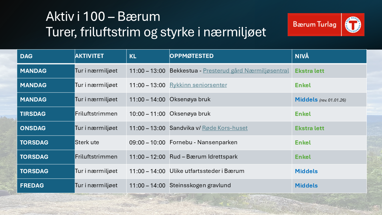 Kom og vær aktiv på dagtid med oss i DNT Bærum Turlag! Bli med oss på turer, friluftstrim og styrketrening.