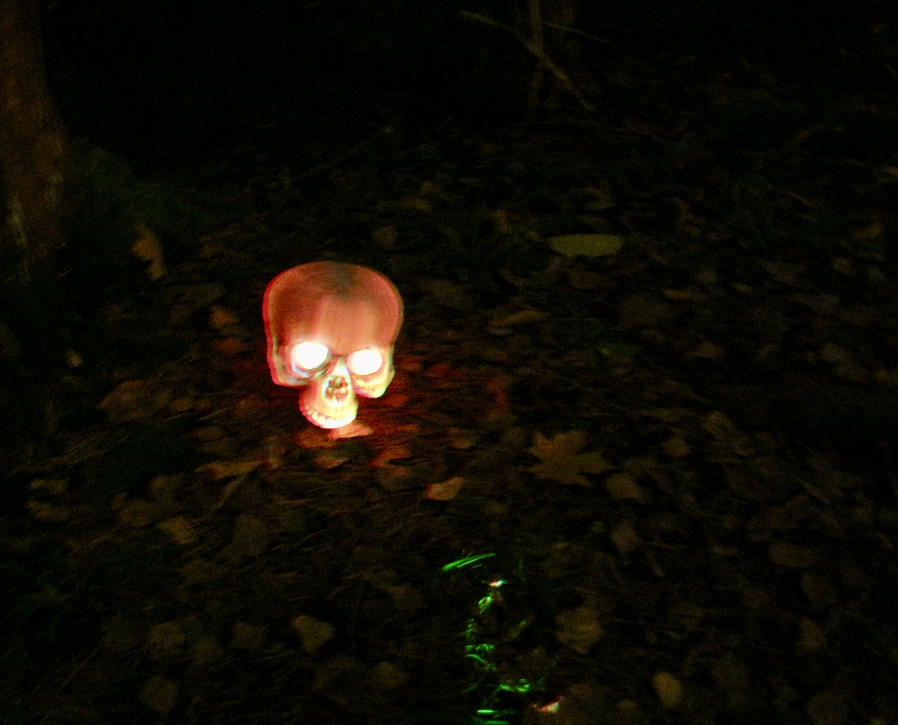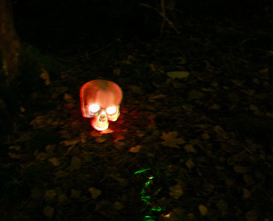 Spente hyl og rop kunne høres inne fra mørket, som noen steder var brutt opp av diverse skumle installasjoner med edderkopper, hekser, spindelvev og annet Halloween-skummelt. Reflekser på trestammene viste vei rundt naturstien og tilbake på parkeringsplassen sto hjelpere fra DNT Bærum Turlag og delte ut overraskelser.