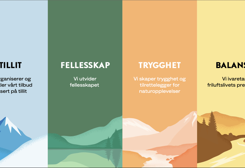 Vi skal forvalte vår rolle som tilrettelegger av infrastruktur og naturopplevelser på en måte som skaper trygghet for dem som ferdes i naturen. Våre stier skal alltid vise vei, våre overnattingssteder skal alltid gi ly til dem som er på tur, og vi skal dele vår kompetanse slik at flere får mulighet til å ferdes trygt i naturen. I en tid hvor endringer skjer raskt og hvor mange opplever usikkerhet skal vi være en trygg, troverdig og tilgjengelig kilde til opplevelser.