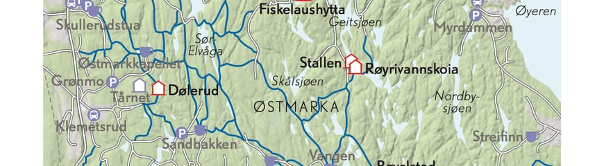 Turkart over DNT-stier- og hytter i Østmarka