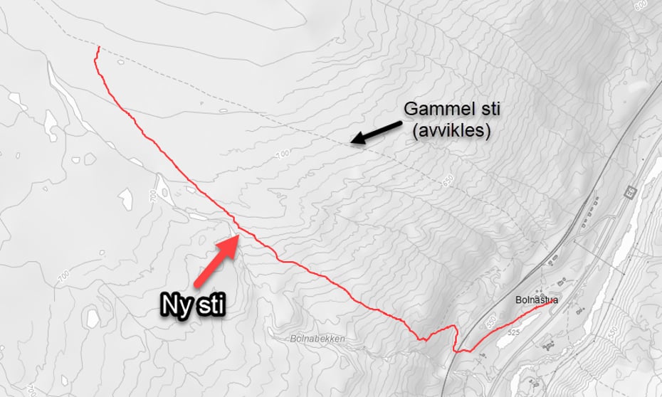 Den nye stien møter gammel sti ca to km opp i høyden. Den gamle ruta ned mot jernbanestasjonen legges ned. Vi har tatt utgangspunkt i en gammel merket sti som går langs Bolnabekken.
