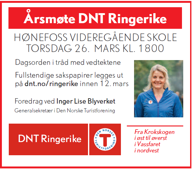 Velkommen til hyggelig årsmøte i DNT Ringerike torsdag 26. mars kl. 1800. Årsmøtet avholdes i Auditoriet på Hønefoss videregående skole. I år blir det foredrag ved ny generalsekretær i DNT, Inger Lise Blyverket. Det gleder vi oss til!
