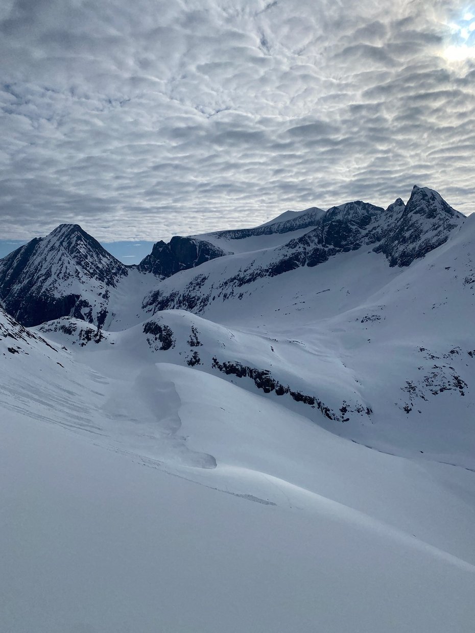 Fra varsom.no 13. april - Generelt stabile forhold. Men vær varsom i solvendte brattheng og der det er fokksnøansamlinger i høyden. Unngå å oppholde deg under glidesprekker og hold god avstand til skavler.