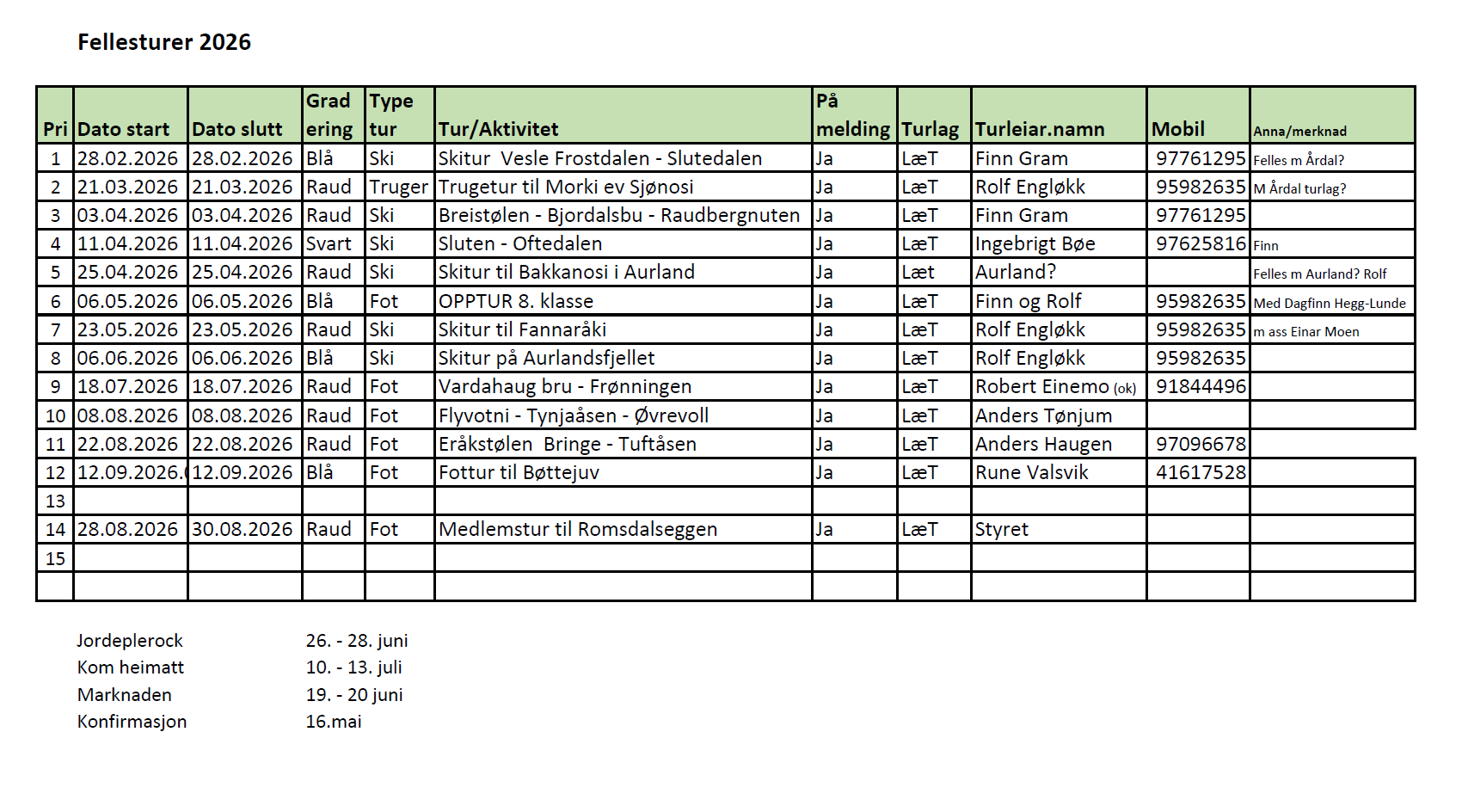Fellesturer er ein sosial, tilrettelagt og trygg måte å kome seg ut på. Mange ynskjer å gå ein lengre tur i fjellet, men er gjerne usikker på om dei tør å setje avgarde på eigenhand. Då er ein fellestur med turlaget løysningen.
