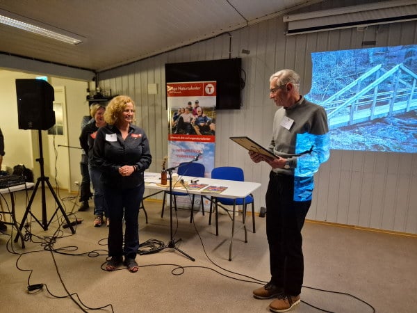 Men det var ikke bare nytt turlag vi kunne juble over. Også en turistknapp i gull ble denne kvelden tildelt en av våre ildsjeler: Asbjørn Heimdal. Han er mangeårig medlem av Skien Turlags løypegruppe og får turistknappen for sin uegennyttige innsats for turlaget og DNT gjennom svært mange år.