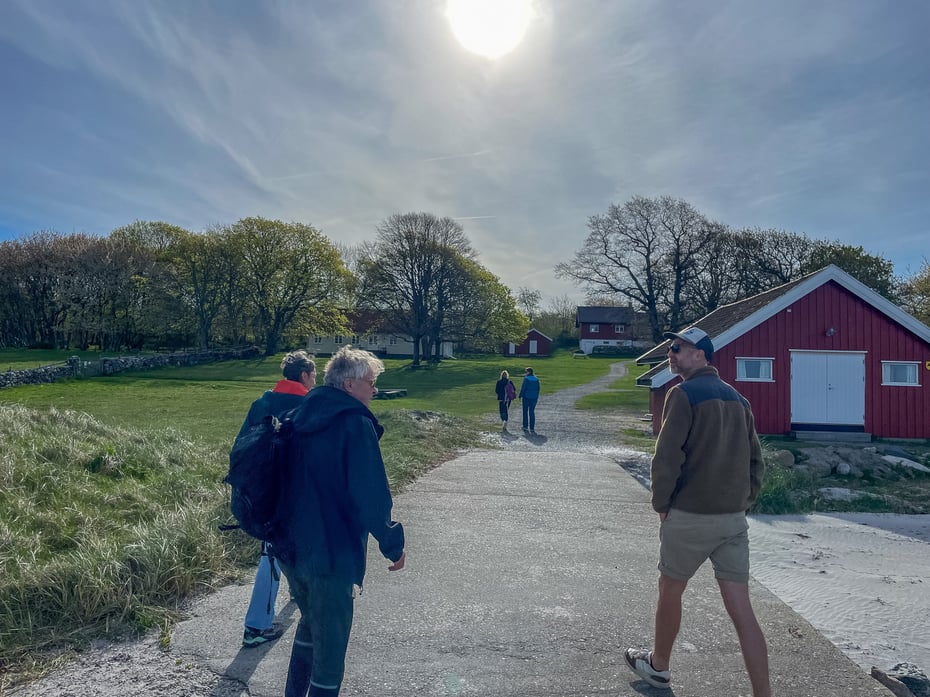 En hyggelig og rask taxitur fra Valle tok oss til nordspissen av øya hvor anlegget DNT Øitangen befinner seg. Det ble servert kaffe på tunet, og reisefølget fant seg godt til rette i Jomfrulands egen atmosfære og ro. Ola fra fuglestasjonen tok turen innom så gjestene fikk hilse på både svarttrost og måltrost, mens vi hørte om det rike fuglelivet på øya. Ruth fra nasjonalparksenteret fortalte om øyas historie og besøkssenteret, samt de mange mulighetene for aktiviteter og opplevelser i Jomfruland nasjonalpark.