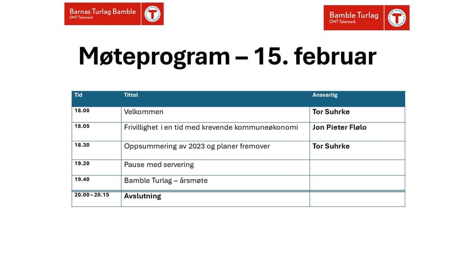 Det inviteres til åpent møte og årsmøte i Bamble Turlag og Barnas Turlag Bamble torsdag 15. februar kl. 1800 på Halen gård. I tillegg til vanlige årsmøtesaker vil ordfører Jon Pieter Flølo reflektere litt rundt frivillig arbeid i perioder med en krevende kommuneøkonomi. Vedlagt ligger Styrets Årsmelding, Regnskap 2023, Budsjett 2024 og Handlingsplan 2019 - 2023. Status 2023.