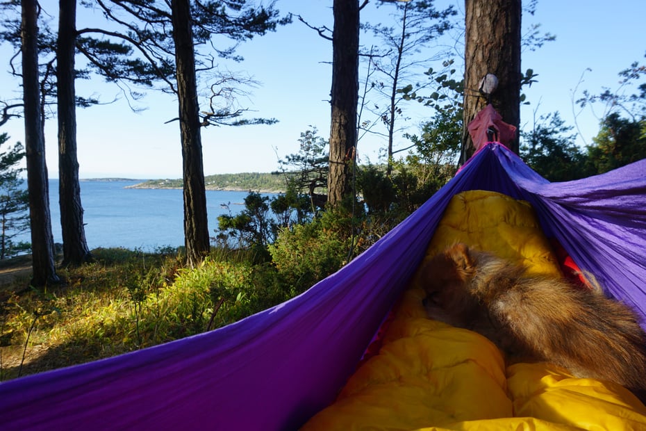 Videre gikk etappen fra Trosby til Rognsåsen. Dette er også en fantastisk strekke, med masse bademuligheter og en del både fastboende og hyttegjester ganske tett på stien. Kroppen begynte å kjenne på mange dager på tur, og med en enda tyngre sekk siden jeg nå gikk alene, kjentes det godt i hoftene. Et bad på Ivarsand og det å omsider få henge opp hengekøya på toppen av Rognsåsen og se sola både gå opp og ned, gjorde at såre føtter føltes bedre. Her, sovende i hengekøya mi rett ved en av fjorårets mest besøkte Ti-Toppere, var det turgåere å hilse på både seint og tidlig. Det er rart hvordan det alltid er lettere å prate med folk når man er på tur.