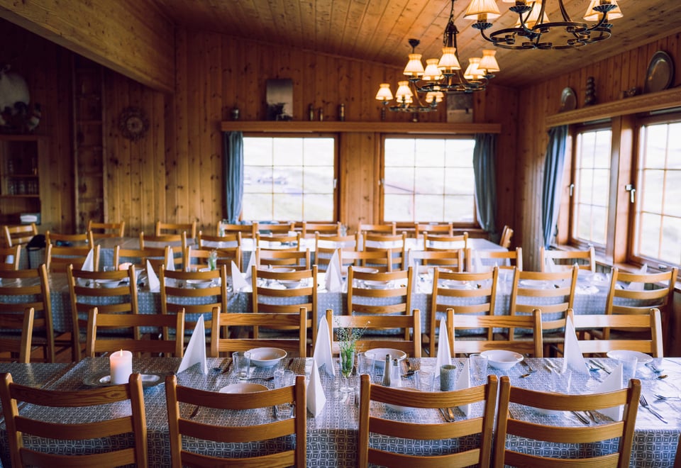 Middagen er dagens høydepunkt på hytta. Menyen er hemmelig frem til middag serveres kl.18:30. For å sikre seg plass på middag må man bestille før klokken 15:00 samme dag.