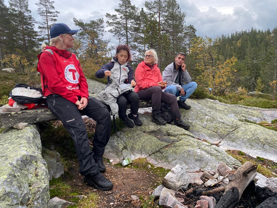 Etter flere dager med regn var det både vått og glatt på stien, men det la ingen demper på turlysten. Selv om værmeldingen varslet mer regn, holdt det seg opp – til stor glede for deltakerne. Praten gikk lett, latteren satt løst, og turen ble en fin avkobling midt i uka.