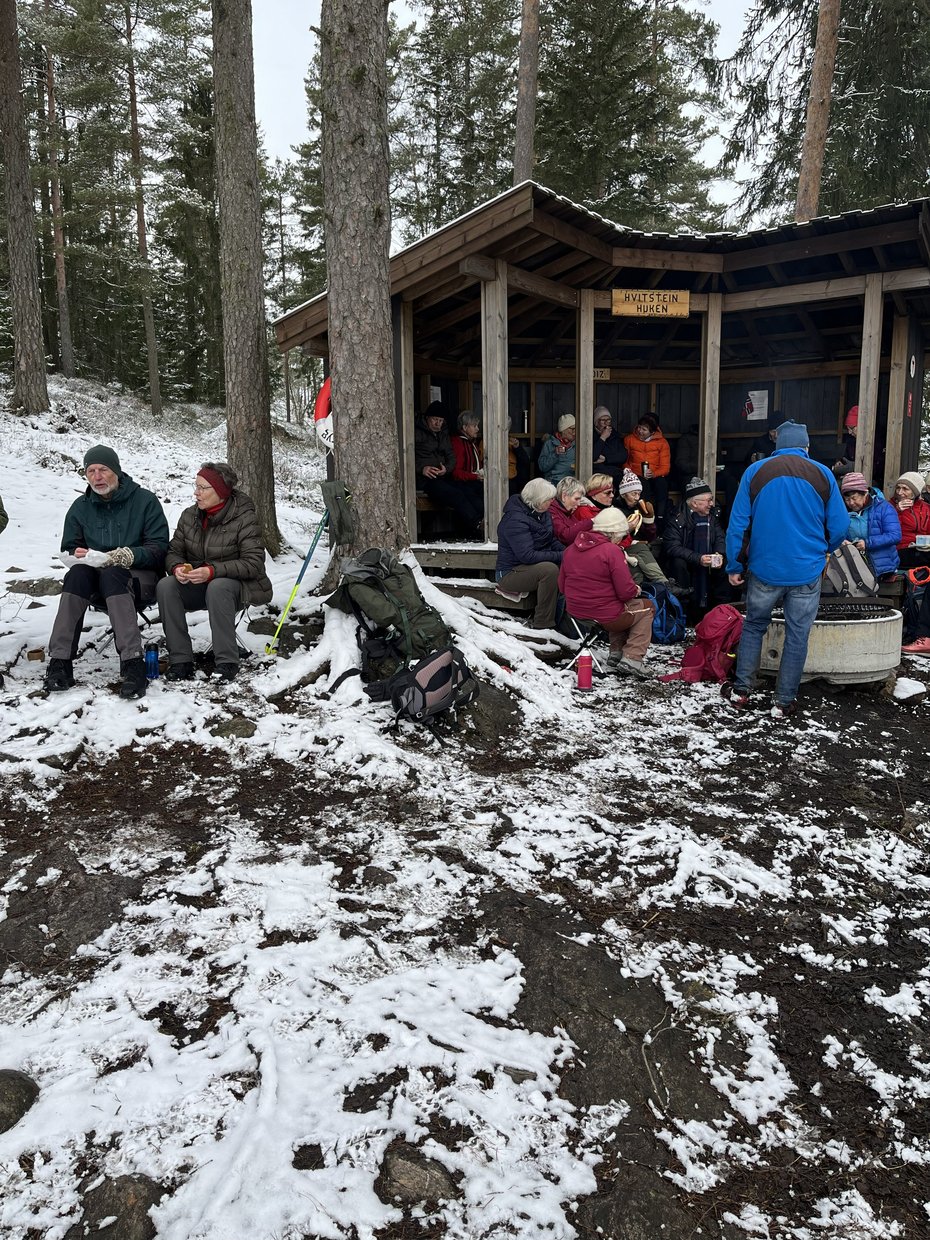 Vi gikk en rundløype fra parkeringsplass Trommedalen og hadde matpause med bål ved Trollets hjerte. Mange fikk plass i gapahuken og resten av flokken rundt bålet. Det er mye trefall i skogen, men også en god del hogst, særlig synlig i området nedenfor parkeringsplassen.