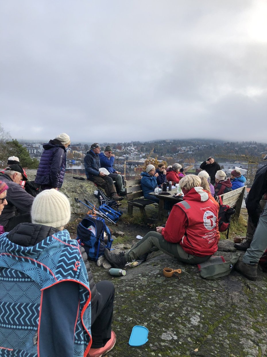 Onsdag 8/11 kom med tåke som en start på dagen. Innen vi var i gang med tur kom sola og ble med oss hele veien. Veien i dag gikk fra Rugtvedtbakken etter at vi hadde kjørt fra Skagerak. Tellekorpset kom til 53 deltakere som vandret avgårde med turleder Yngve foran. Et lite stykke asfalt før vi kom inn i boligområdet og videre på jorder og skog før vi kom til det fineste område ved Kverndammen med gapahuk og tipier. Men vi må gå videre. Over demningen bar det oppover mot Frydentopp som ble dagens mål og bål og mat! Her er det fin utsikt mot by og fjord, samt den hvite porselens kirka som det engang var heftig diskusjon om var bra eller dårlig. Tror diskusjonen har stilnet. En turgåer sluttet seg til turen så dagens endelige antall ble 54! Marit orienterte om neste ukes tur til Galtetjern og minnet om oppmøte Skagerak og om brodder, i hvert fall i sekken.