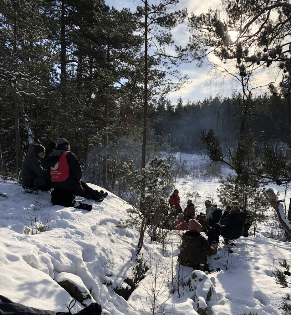 Her ble det bål, matpakker og mye prat og latter, i strålende sol! Tror hele flokken er takknemlig for frisk luft, litt mosjon og trivelig samvær. Det er ikke plass til 50 i gapahuken så noen må litt opp i terrenget for å finne plass. Dette bildet er tatt fra «2.etasje».
