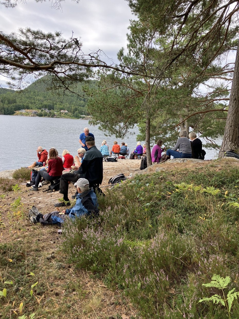 Etter en velfortjent matpause ved vannkanten må flokken vende tilbake til bilene. Men det må nevnes at ei sprek dame tok en svømmetur, tror hun sa at det var 20 grader i vannet,