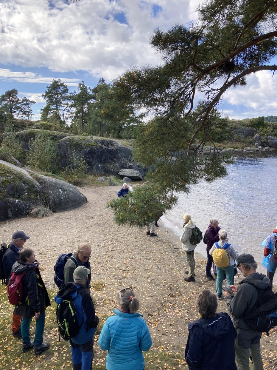 Vi hadde tenkt oss inn til Ødegården, en gang et småbruk, men nå bare en brønnpumpe å se. Dit kom vi ikke fordi veien lå under sjøen! Høyvann og pålandsvind eller springflo, vi måtte snu! Tok derfor stien mot Bålsrudvannet og tok rasten ved hogsfeltet. Litt duskregn som ga seg før rasten, og så kom solen. Retur på samme sti, med en avstikker ut langs kanalen i Barkvik til en nydelig sandstrand. En overraskelse for mange av de 52 turdeltakerne.