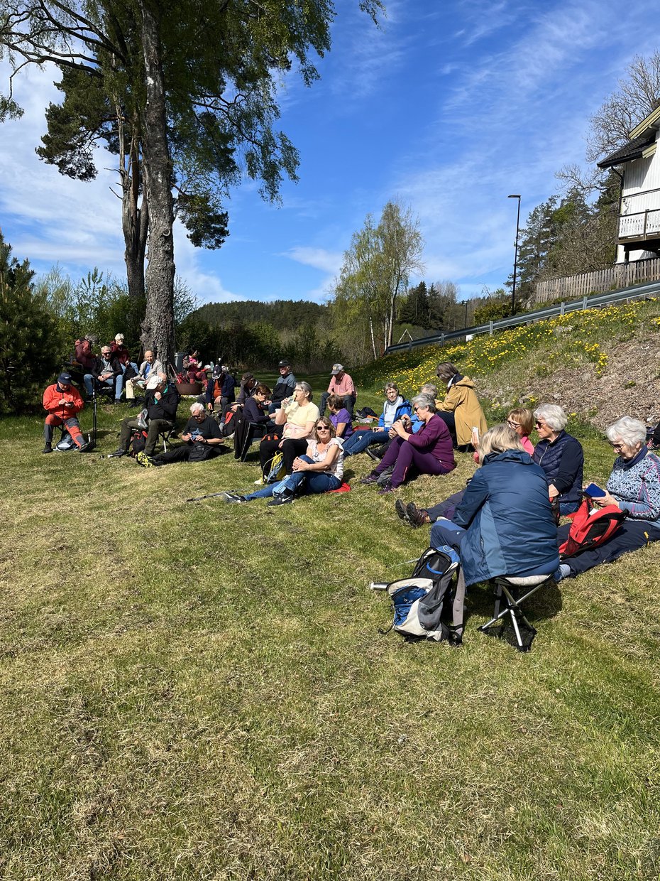 Vi koste oss med niste og prat ved vannet inn mot Løveid. Vårsola og det fine grøntområde satte en ekstra spiss på turen.