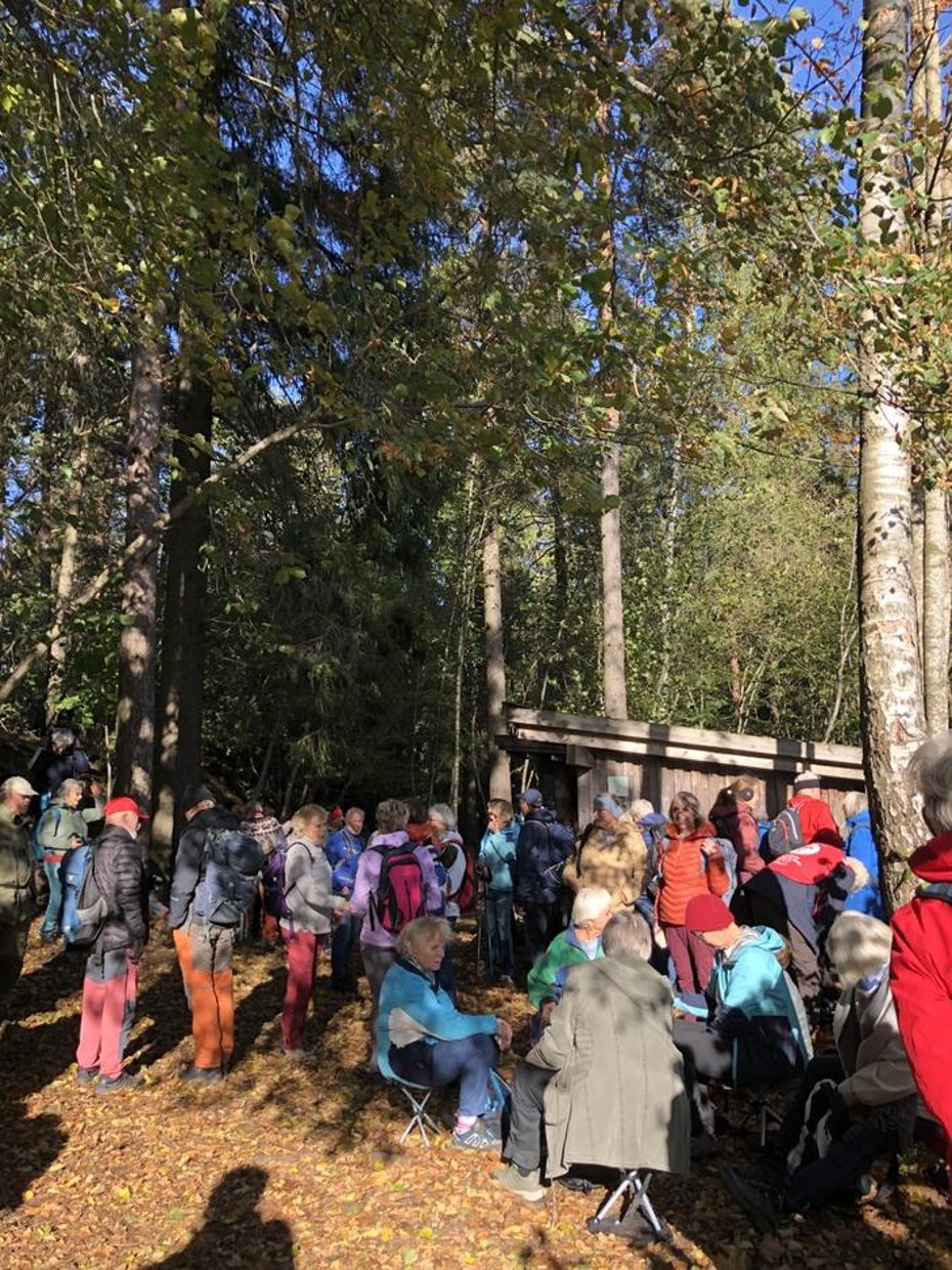 Så populær er denne turen at 69 fine folk ville bli med! Vi stoppet som vanlig ved Jacob Aalls utsikt, hvor det blir tatt mange bilder. Vi vandrer i fredelige skogområder og passerer gjerdet mot kalksteinbruddet til Norcem, Bjørntvedtbruddet. Det blåser friskt, løvet faller, sola skinner og livet er fint. Vondt er det å tenke på at mens vi har det trivelig på tur er det nå veldig mange lidelser pga krig. Kriger som ikke er så altfor langt borte fra vårt land.