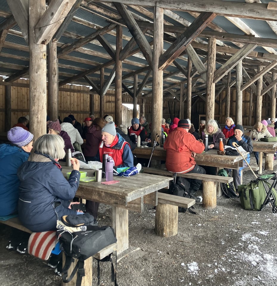 Det er en grå tåkete dag med yr i lufta og det er meldt om fare for glatte veier for både kjørende og gående. 43 turglade bryr seg ikke om slikt, de tar på seg passende klær og sko og stiller opp for å bli med på lavterskeltur! Turen gikk til Skotfoss med start fra pipa. Vi gikk strake veien til Tors plass hvor vi hadde matpause. I dag var det fint å sitte under tak for å slippe nedbør på brødskiva.