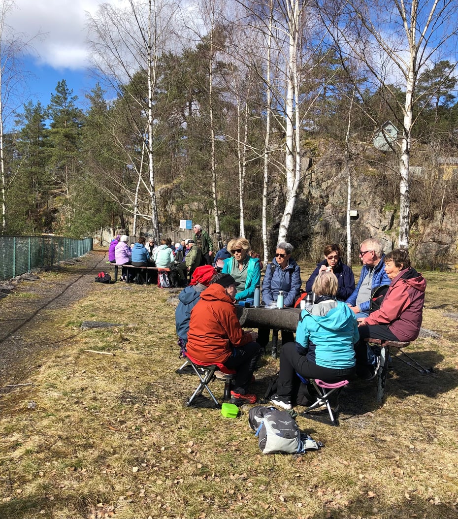 Så bar det oppover over Saglandsåsen, ned til det flotte administrasjonsbygget. Neste etappe er turen langs fossen/elva ut til Tors plass, som er dagens rasteplass med plass til mange. I alle grupperingene var det latter og snakk, det liker vi! Dagens tre nykommere ble ønsket velkommen og vi håper de blir med videre.