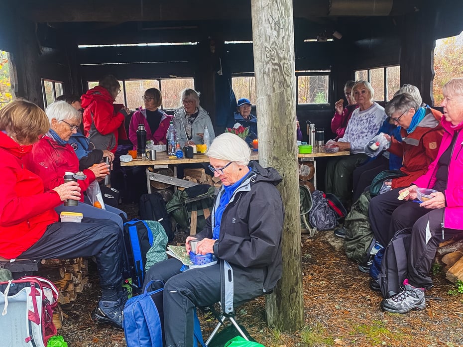 Et lett regnskyll i starten og litt duskregn under rastestoppen la ingen demper på stemningen. Da turfølget kom fram til hytta, ventet en hyggelig overraskelse – brødrene Lid hadde fyrt opp bålpannene, noe som virkelig varmet på en grå høstdag.