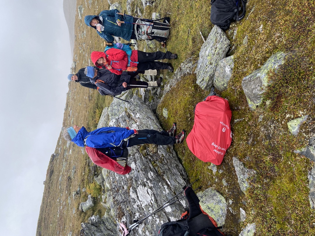 Søndagen startet med blide fjes under regnhettene, førnøyde med at vinden kom i ryggen. Enda bedre ble det da sola og reinsdyra titta fram ved lunsjtider. Underveis fant vi enda flere steiner, hørte flere historier og kulturinnslag med strofer fra Ibsens «På vidderne, 1862».