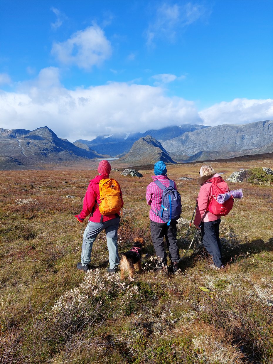 Inne ved Bruskartjernet hadde vi matpakkepause, men snakk om tamreindriften i omtådet, før vi gikk opp på toppen av Sørre Bruskarknappe. Utsikten der oppe er fantastisk i alle retninger, litt vindfullt ble det på toppen Ofte ser vi reinsdyr på denne turen, men i dag var de vekk. Turen tilbake gikk nedover den vanlige stien til Bruskarknappen. Været var dårlig inne i Jotunheimen, men vi hadde sol og flott høstvær.