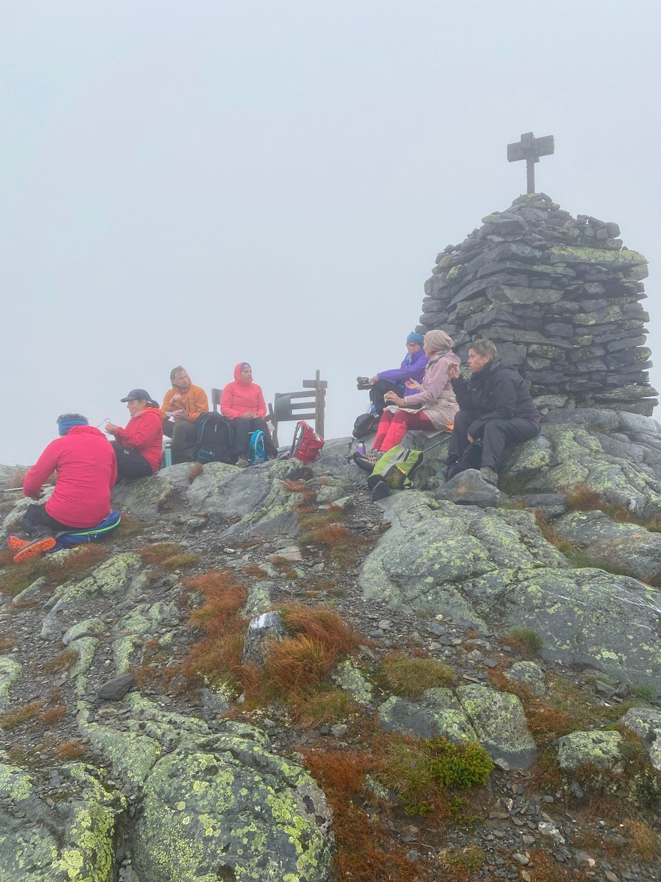 Da vi nådde toppen av Bjørgovarden, var tåken fortsatt tett, men vi klarte å se et glimt av landskapet under oss. Utsikten var kanskje ikke den beste, men det ga oss en følelse av å være i et eventyr. Vi tok noen bilder og spiste litt niste i det litt kalde fuktige været. Samtalen fløt lett, og vi diskuterte hvordan naturen kan være vakker selv under mindre enn ideelle forhold. Humor og gode historier fylte luften, noe som virkelig løftet stemningen.