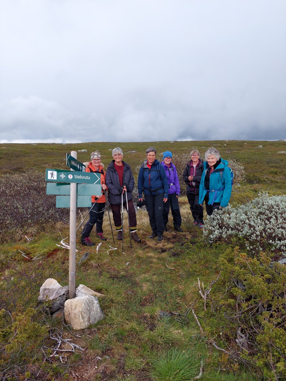 Foto stopp ved sti krysset Stølsruta mot Jaslangen, før vi fortsatte oppover til Svenskeknippa. Vel oppe på toppen 1305 moh ble det en noe kort og litt kjølig matpause.