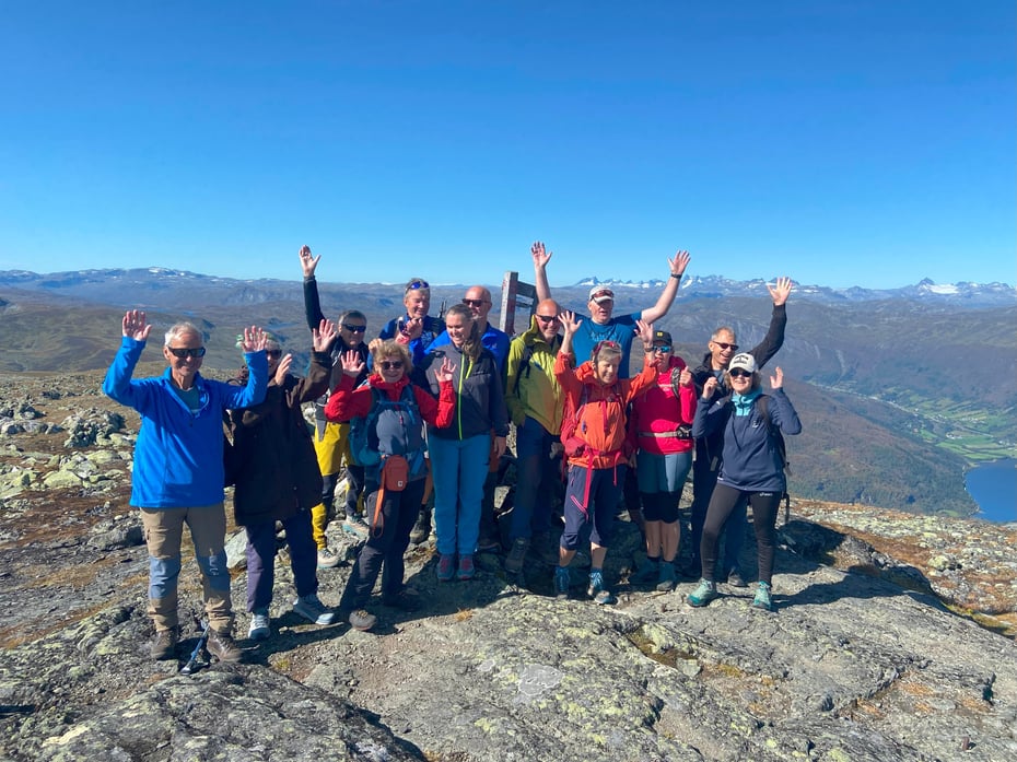 Da vi endelig nådde Skjøld, ble vi belønnet med en spektakulær utsikt. Solen skinte klart, og vi kunne se milevis i alle retninger, og spesielt vakkert var det med tindene i Hurrungane og Jotunheimen. Men også utsikten ned mot bygda Øye kan ta pusten fra alle og enhver. Det var en perfekt anledning til å ta bilder og nyte mer mat i det vakre landskapet. Stemningen var fantastisk, med latter og gode samtaler. Flere av deltakerne delte historier om tidligere turer, noe som skapte en følelse av fellesskap.