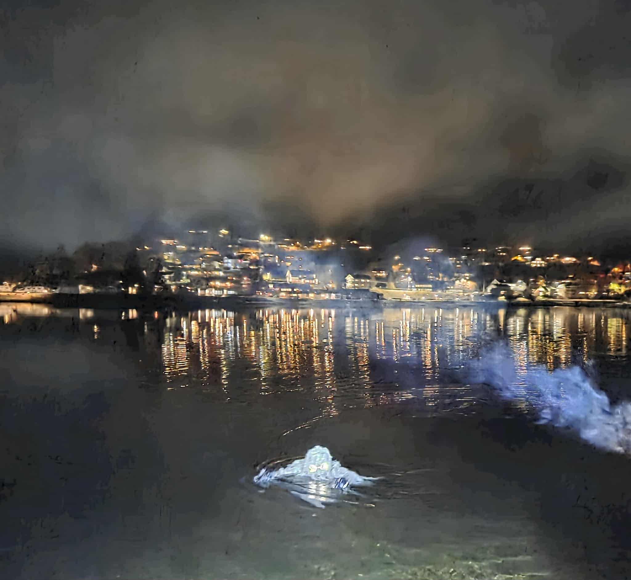 Ute på Vesleøya hadde vi rigget til en liten camp med tarp som vi kunne sitte under og varm kakao til alle. Ute i vannet hadde vi fakler og bålpanne for å skape stemning.
