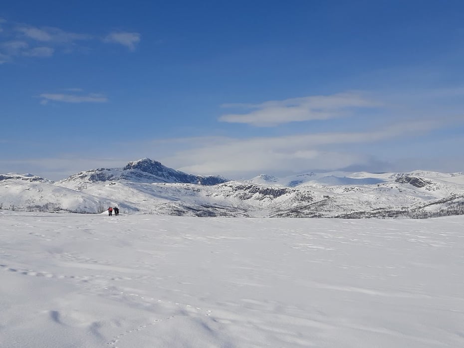 Første delen av turen gjekk i nesten flatt lende før det gjekk i slake utforbakkar forbi toppen på to skiheisar, så i litt brattare bakkar ned til startpunktet av den sørre skiheisen. Snart bar det i litt bratte og flate parti oppover på baksida av Knausane. Halvveges oppe hadde nokon laga ein lun sitjeplass som vi overtok. Vi hadde ein lang og god rast med niste, varm drikke og hyggeleg turprat.
