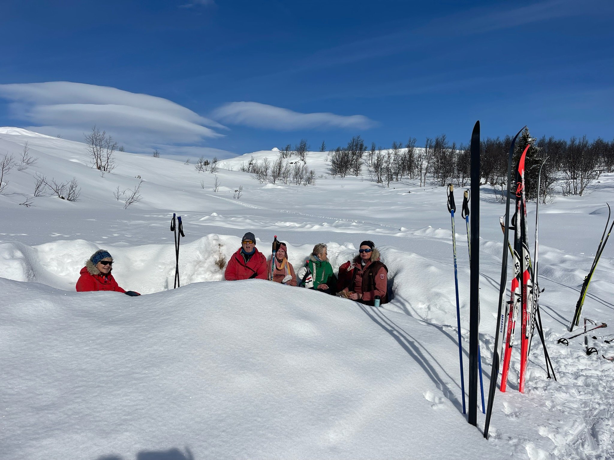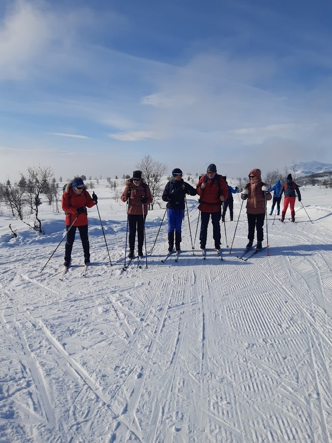 Vi var 5 damer, ein mann og 1 hund på turen. Veret var strålande, nesten vindstille og løypene nykøyrde. Det var svært få andre skiløparar å sjå denne dagen, og dei vi møtte, var nok for det meste utlendingar.