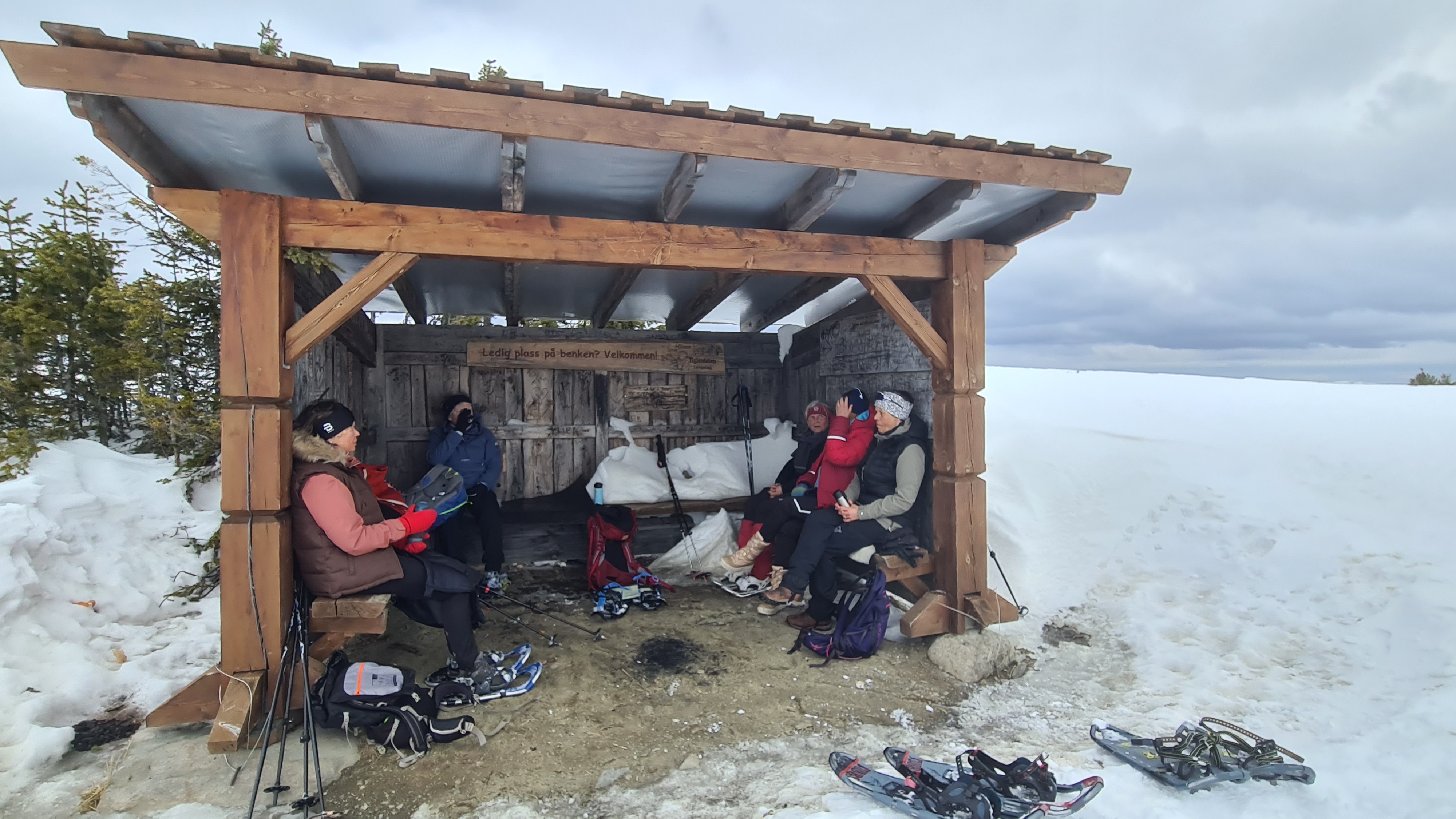 Været var ikke av det aller beste med litt vind og lavt skydekke. På toppen er en sikteskive og vi kunne likevel finne ut hvilke fjell vi så og ikke så. Toppen har også en gapahuk der vi fant noe ly og kunne nyte det som var medbrakt i sekken.